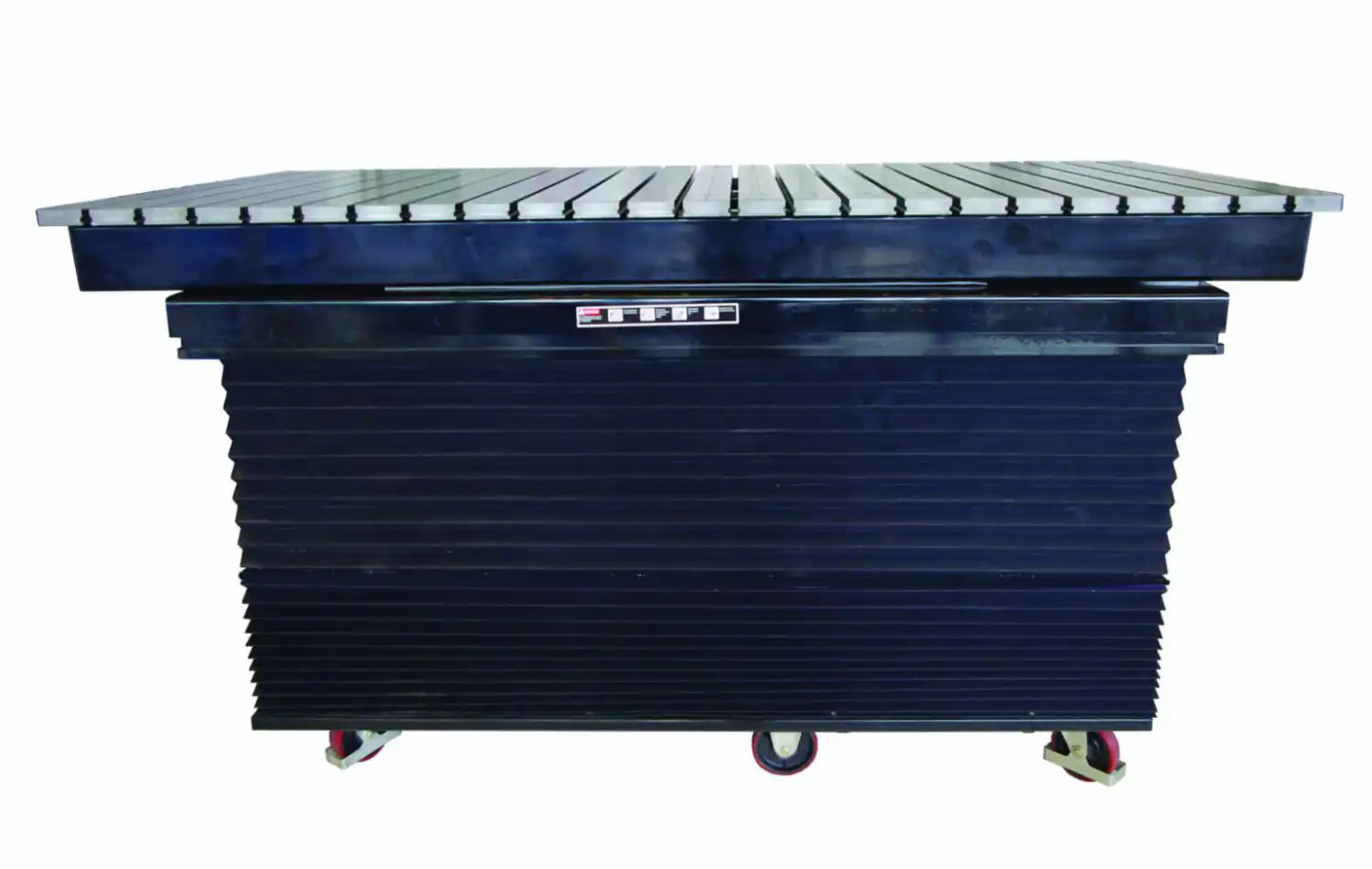 Die Tischbrücken sind auf einem Schienensystem selbstabhebend verfahrbar und können in einem Raster von 100 mm abhubsicher fixiert werden.